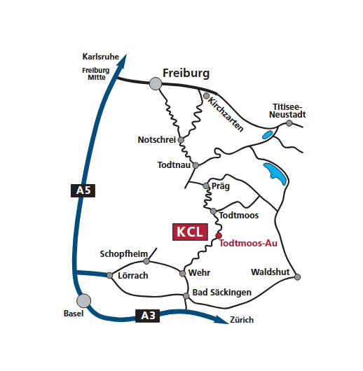 Anfahrt nach Basel Bad (Badischer Bahnhof) – von dort in die Regionalbahn Richtung Waldshut umsteigen. Am Zielbahnhof Bad Säckingen aussteigen und von dort den Bus (Linie 7320) nach Todtmoos-Au nehmen. Hier befindet sich das Zentrum KCL.